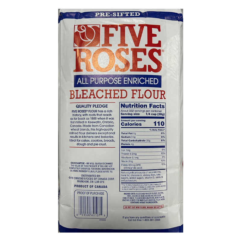 Bring home a kitchen essential with Five Roses All-Purpose Flour – 22 lb (10 kg), trusted by home bakers and professionals alike. Made from high-quality Canadian wheat, this enriched white flour is perfect for all your baking and cooking needs. From bread loaves and pizza dough to cookies, pastries, and more, Five Roses delivers reliable texture and flavor every time. Pre-sifted for convenience and packed in a bulk-size bag, it’s ideal for families, bakeries, and food service. Whether you’re baking from scratch or following a cherished recipe, Five Roses gives your creations the foundation they deserve.
